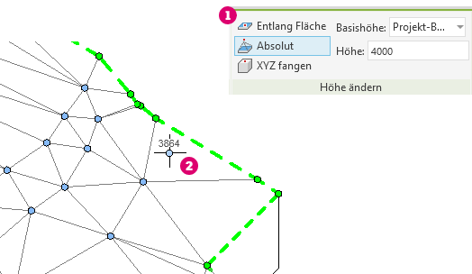 Wenn Sie während der Formbearbeitung Punkte hinzufügen, können Sie die Einstellung Basishöhe verwenden, um die relative Höhe des Punkts zu definieren. Sie können die Höhen von der aktuellen Ebene, vom Projekt-Basispunkt, vom Vermessungspunkt und vom internen Ursprung aus messen. Sie können festlegen, ob die Punkte in einer absoluten Höhe von der ausgewählten Bezugsebene hinzugefügt werden oder in einem bestimmten Abstand von der bestehenden Oberfläche.
