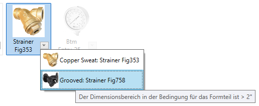 Wenn Sie auf den Pfeil klicken, wird eine Dropdown-Liste mit zusätzlichen Teilen, basierend auf der Dimension, angezeigt. Diese Dropdown-Liste wird ähnlich wie bei Routing-Voreinstellungen durch die in der Definition der Kategorie festgelegten Bedingungen gesteuert. Beispielsweise kann für eine Biegung bis zu einer bestimmten Dimension ein gepresster, für größere Dimensionen dagegen ein Segmentbogen verwendet werden. Wenn Sie den Mauszeiger über ein Teil in der Liste bewegen, wird eine QuickInfo angezeigt, in der der Dimensionsbereich gemäß der Bedingung für das Teil angegeben wird.