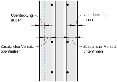 | Zusätzlicher Überdeckungsversatz oben/außen | Gibt zusätzlichen Versatz von der oberen/äußeren Bewehrungsüberdeckung an. Hierdurch können mehrere Bewehrungselemente zusammen in verschiedenen Flächenbewehrungsschichten platziert werden. |
