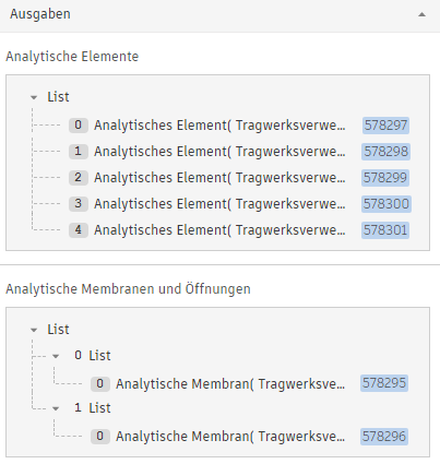 Nach dem Erstellen oder Aktualisieren werden alle analytischen Elemente in zwei Listen gruppiert: eine für die Elemente und die andere für Membranen und Öffnungen.