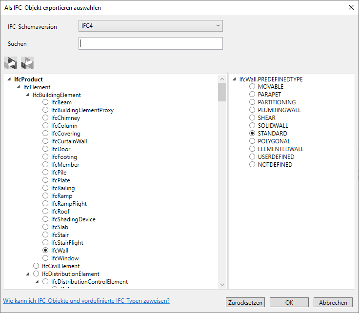 IFC-Parameter, die die Exportzuordnung von Elementen steuern, sind vorgabemäßig in Elementen und Typen enthalten. Verwenden Sie das Dialogfeld Exportzuordnung zum Ändern von IFC-Objekten und vordefinierten Typen, die für den Export verwendet werden.