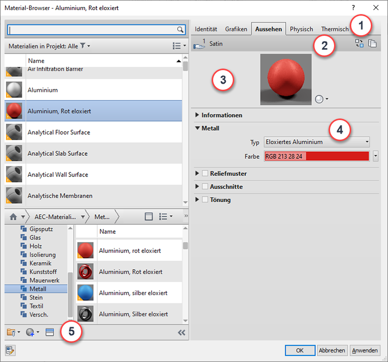 4 Eigenschaftenbereich: Hier können Sie detaillierte Eigenschaften des ausgewählten Objekts anzeigen und verwalten. Der Name und die Beschreibung des Objekts werden unterhalb des Bereichs Informationen angezeigt. Im Beispiel oben werden die Eigenschaften unter Metall für das Darstellungsobjekt Eloxiert - Rot angezeigt (d. h., dieser Abschnitt ist erweitert). Der Satz der für eine Flüssigkeit angezeigten Eigenschaften unterscheidet sich beispielsweise vom Satz der für Metall angezeigten Eigenschaften.