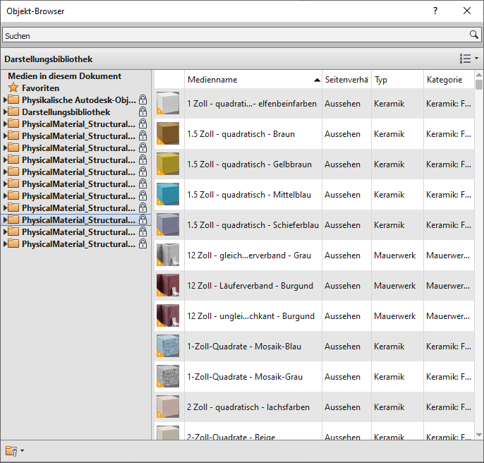 Tipp: Verwenden Sie die neuen Darstellungsobjekte (ohne Symbol) für Materialien. Auf diese Weise wird sichergestellt, dass Ansichten und gerenderte Bilder die neuesten, hochwertigsten Darstellungen von Materialien verwenden.