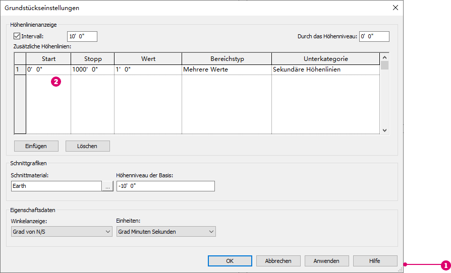 Dialogfeld Grundstückseinstellungen