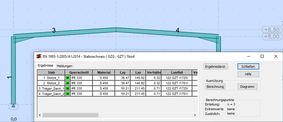 Die Option Stahlbemessung bietet die Möglichkeit, die in der Struktur verwendeten Querschnitte schnell und effizient zu überprüfen.