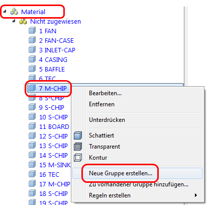 Erweitern Sie in der Designstudienleiste den Zweig Material. Klicken Sie mit der rechten Maustaste auf eines der Teile mit der Bezeichnung M-Chip, und wählen Sie Neue Gruppe erstellen.