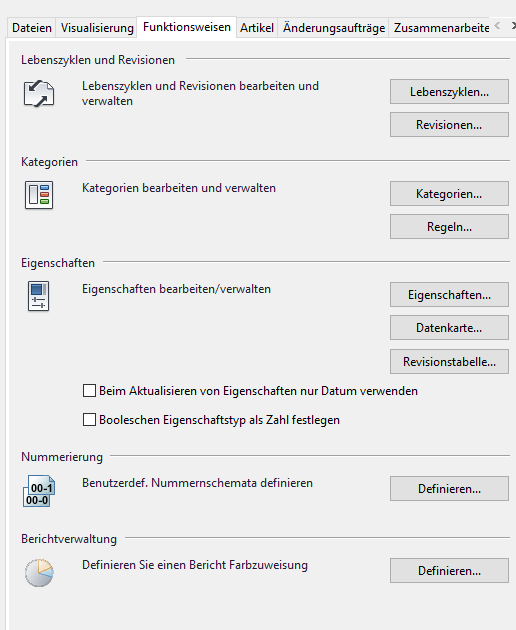 Die Registerkarte Funktionsweisen im Dialogfeld Tresoreinstellungen beinhaltet Optionen zum Bearbeiten von Lebenszyklus-Definitionen und zum Verwalten von Revisionen, zum Verwalten von Kategorien und Regeln, zum Erstellen und Ändern von Eigenschaften, zum Definieren von benutzerdefinierten Nummernschemata und zum Zuweisen von Berichtsfarben.