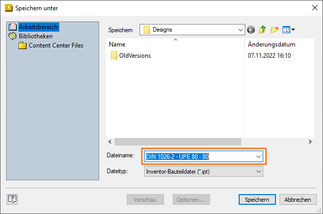 Wenn Sie hier eine benutzerdefinierte Inhaltscenter-Komponente im Projektpfad speichern, ist das Dialogfeld Speichern unter Teil der Option Aus Inhaltscenter platzieren. Das Dialogfeld VDS überschreibt sowohl den Dateispeicherort (wie im Dialogfeld VDS ausgewählt) als auch den Dateinamen mit der Vault-Nummer oder dem manuellen Dateinamen.
