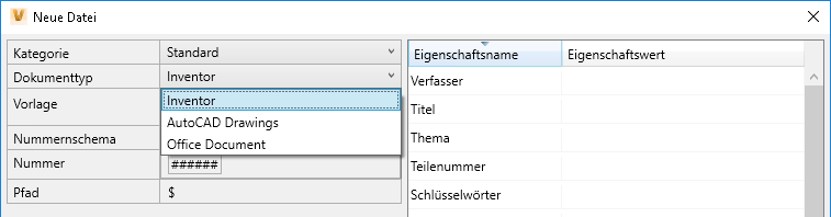 Das vorgegebene Dialogfeld Neue Datei für Data Standard enthält ein Kombinationsfeld mit dem Namen Dokumenttyp.