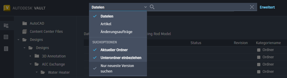 Wenn die Option Aktueller Ordner nicht ausgewählt ist, ist die Option Unterordner einbeziehen vorgabemäßig ebenfalls deaktiviert.