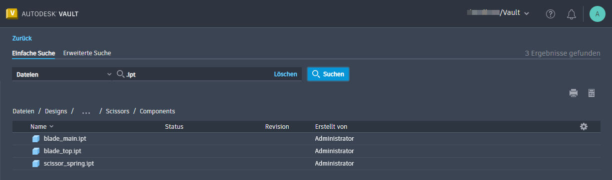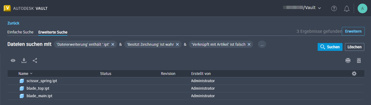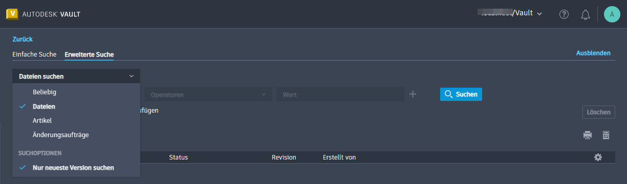 Sie können Objekte mithilfe der erweiterten Suchkriterien an beliebigen Stellen in einem Tresor oder in verschiedenen Arbeitsbereichen suchen. Vorgabemäßig wird eine erweiterte Suche in dem Arbeitsbereich initiiert, aus dem sie gestartet wird. Wenn Sie sich beispielsweise im Arbeitsbereich Artikel befinden und die erweiterte Suche durchführen, gibt die Suche nur Ergebnisse aus dem Arbeitsbereich Artikel zurück.