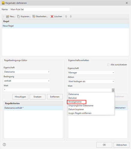 Wenn sich der Anzeigename und der Benutzername unterscheiden, wurde bisher der Anzeigename für den Eigenschaftswert der Datei angezeigt. Im Regelsatzverhalten von Copy Design ist der Eigenschaftswert jedoch auf "Benutzer" festgelegt. Mit diesem Update haben Sie jetzt die Möglichkeit, den Eigenschaftswert (Benutzer oder Anzeigename) auszuwählen, den Sie anzeigen möchten, während Sie das Regelsatzverhalten von Copy Design definieren.