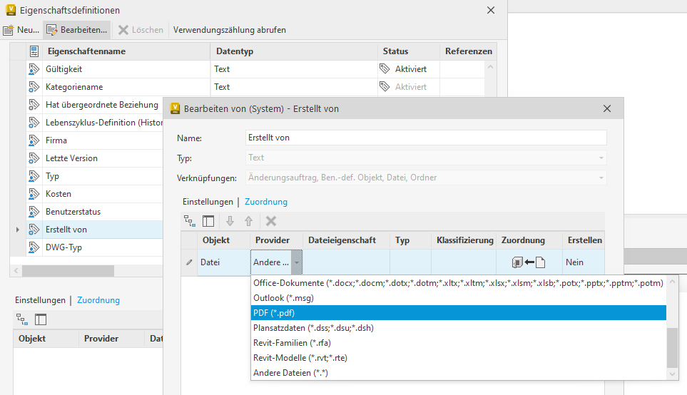 Zuvor war keine Zuordnung für die Systemeigenschaft Erstellt von verfügbar. In der aktuellen Version wurde nun die Zuordnung Tresor zu Datei für diese Eigenschaft hinzugefügt. Sie können diese Zuordnung nutzen, um die Eigenschaft Erstellt von direkt in die Dateieigenschaften zu übernehmen. Sie können diese Eigenschaft auch mehreren Eigenschaftenquellen-Providern zuordnen.