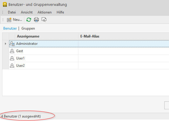 Sie können jetzt die Gesamtanzahl und die Anzahl der ausgewählten Benutzer (und Gruppen) im Dialogfeld Benutzer- und Gruppenverwaltung anzeigen. Die Anzahl basiert auf der angezeigten Anzahl von Benutzern und Gruppen.