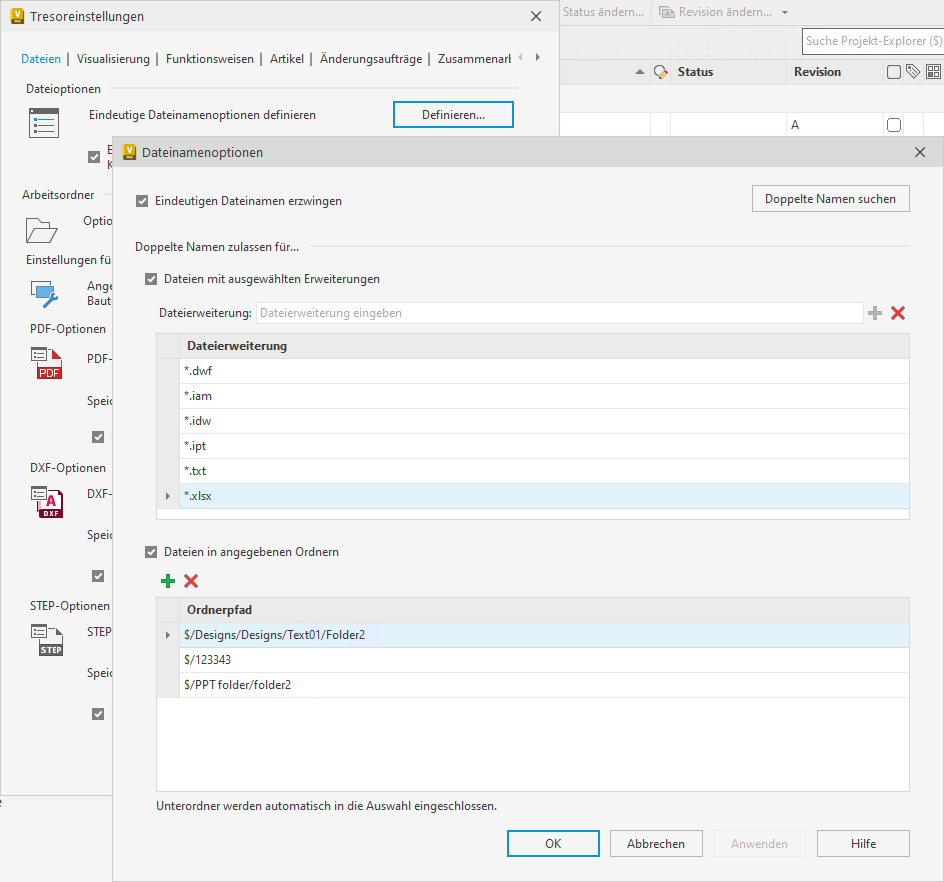 Bei Erzwingung eindeutiger Dateinamen muss jede Datei im Tresor einen eindeutigen, identifizierenden Namen aufweisen. Die Inventor-Konstruktionsdaten und der Vorlagenspeicherort weisen jedoch je nach Ordnerstruktur dieselben Dateinamen auf. Wenn also eine eindeutige Dateinamensprüfung erzwungen wird, können diese Dateien möglicherweise nicht eingecheckt werden.