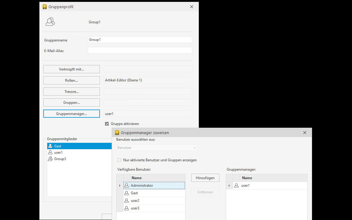In dieser Vault-Version wird eine neue Rolle Gruppenmanager zum Verwalten von Mitgliedern der Gruppe eingeführt. Ein Gruppenmanager ist ein Benutzer mit bestimmten Benutzer- und Gruppenverwaltungsberechtigungen, der festgelegten Gruppen vorhandene oder neue Benutzer zuweisen kann. Die Rolle eines Gruppenmanagers ist auf die Verwaltung dedizierter Gruppen beschränkt.