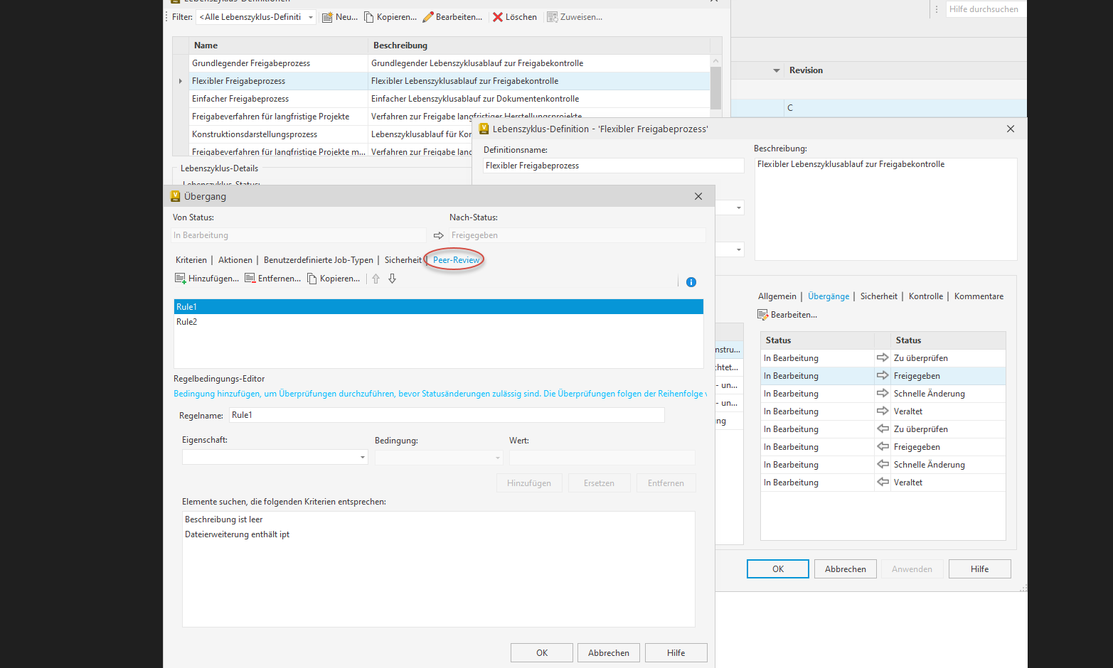 Als Administrator können Sie ein Peer-Review konfigurieren, das durchgeführt werden muss, bevor eine Statusänderung vorgenommen werden kann. Der Kontrollmechanismus prüft, ob der aktuelle Benutzer nicht derselbe Benutzer ist, der die vorherige Statusänderung ausgeführt hat. Diese Funktion kann verwendet werden, um die Delegierung von Befugnissen zu erleichtern und die Transparenz zu erhöhen.