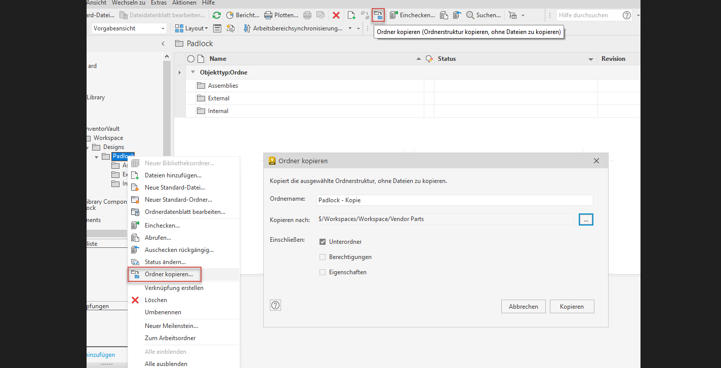 Stücklistenobjekt entfernen: Konstruktion kopieren unterstützt jetzt die Option zum Entfernen von Stücklisteninformationen nur innerhalb der übergeordneten Dateien. Somit werden die Stücklisteninformationen der untergeordneten Dateien während des Kopiervorgangs aktualisiert. Vorgabemäßig ist die Option Stücklistenobjekte nur aus übergeordneten Objekten entfernen aktiviert. Weitere Informationen finden Sie unter Benutzeroberfläche von Konstruktion kopieren.