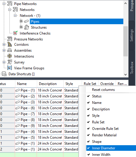 You can quickly edit the styles of many pipes or structures in the Prospector tab for that pipe network as shown in figure 3.