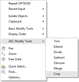 Before you add contour polyline data to a surface, consider whether it includes any terrain that is not needed for design purposes. If so, you can use the AEC modify tools to crop unwanted portions of the contours. As shown in figure 5, these tools are available on the right-click menu when no objects are selected in the drawing.