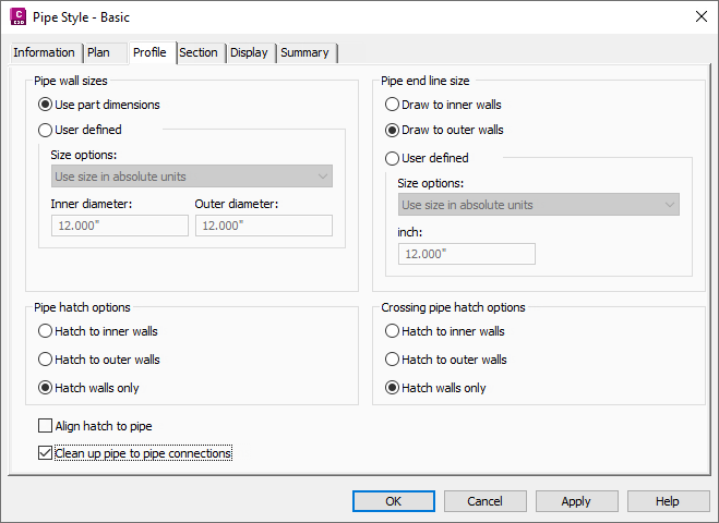 Use the Clean Up Pipe To Pipe Connections option in the Pipe Style dialog box, as shown in figure 4, to improve the appearance of pipe profiles so that the pipes graphically appear to line up as expected. This option is not enabled by the default, so you must select it.
