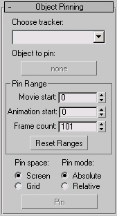 - Performs the actual pinning, moves the object to follow the selected feature and places a keyframe at each frame in the pin frame range. As with the other keyframing operations in the tracker, you can undo a pin using the 3ds Max Undo function. You might also find it useful to perform keyframe reduction afterwards in Track View.