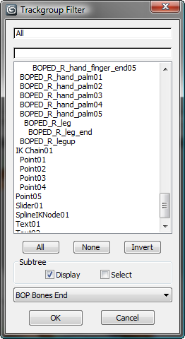 3ds Max opens the Trackgroup Filter dialog. By default, all body parts are selected.