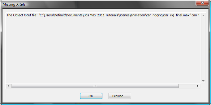 If you load or render a scene with XRefs, but the originally specified path of the XRef object or scene can’t be found, or if the XRef object name doesn’t match the object name in the source file, an alert appears telling you this.