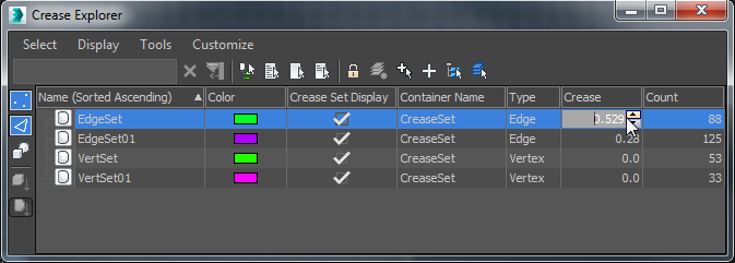 - The name of each crease set in the scene. To rename a set in Crease Explorer, double-click its name slowly.