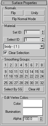 These controls let you work with patch normals, material IDs, smoothing groups and vertex colors.