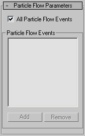 Use this rollout if you have added a Particle Flow system to the blobmesh, and want particles to generate metaballs only during specific events. Before you can specify events on this rollout, you must add the Particle Flow system to the blobmesh on the Parameters rollout.