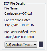 For example, a DXF file called Carriageway1.dxf will have the material channel 18 (Asphalt) applied to any surfaces found within it. Surfaces found within a DXF file called Ground1.dxf will have the material channel of 27 Ground Type 2 applied.