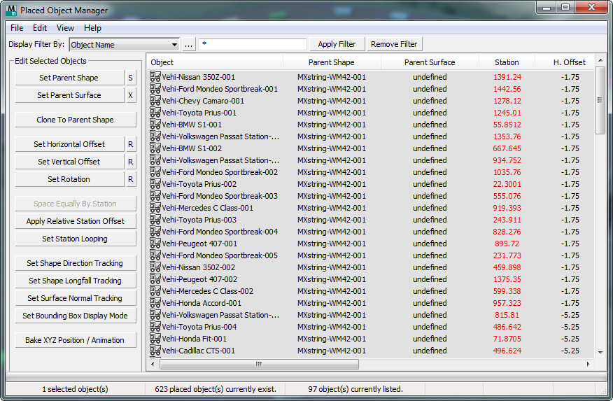 - Filter the contents of the object list based on an individual parent shape, parent surface, object category, or object name mask.