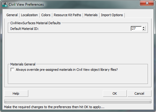 When on, material pre-assignments found in source .max files are always ignored and overwritten with the normal Civil View material definitions from the current scene.