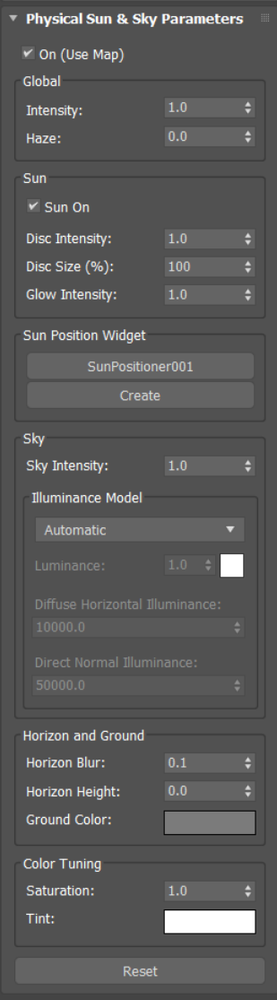 The Physical Sun and Sky Parameters Rollout sets parameters on the Physical Sun & Sky environment map. This is the same rollout as displayed for the Physical Sun & Sky environment map in the Slate Material Editor.
