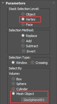 As the geosphere moves through the cylinder, vertices from Cylinder001 that are inside GeoSphere001 are selected.