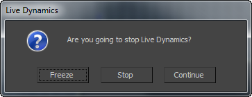 If you press Esc while using live dynamics, 3ds Max displays a dialog that asks whether you want to stop live dynamics. Both Freeze and Stop reset the mode to None, but Freeze freezes the hair in its current position. You can use this as a starting point for precomputed dynamics, or as a point from which you style the hair.