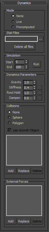 Determines the extent of the simulation, and lets you run it. These controls become available only after you choose Precomputed mode and specify stat files in the Stat Files group. Set Start and End to the frames at which to begin and end the simulation, and then click the Run button. 3ds Max then computes the dynamics and saves the stat files.