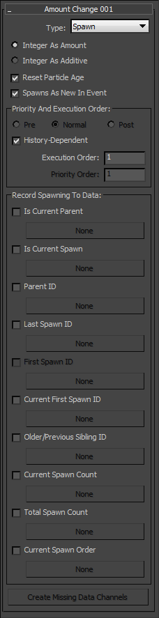 These controls let you record spawning properties and details into custom channels. The custom channels have to be created in advance with the Output New suboperator. The data in the custom channels are updated during the Amount Change execution. Therefore, in order to obtain these data, you have to request the data from the custom channels (usually with the Input Custom suboperator) in the data stream with Execution Order value set higher than the Execution Order value of the Amount Change suboperator.