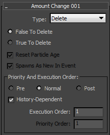 - The type determines whether Amount Change creates (spawns) particles or deletes them. When Type is set to Delete, the only controls available are False To Delete/True To Delete and Execution Order. Default=Spawn.