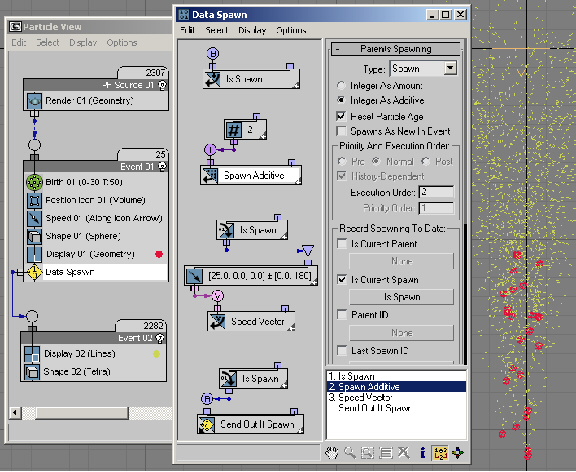 Note: In this scene, the original (parent) particles move along the PF Source icon arrow, as defined by the standard Speed operator, while spawned particles move in various directions.