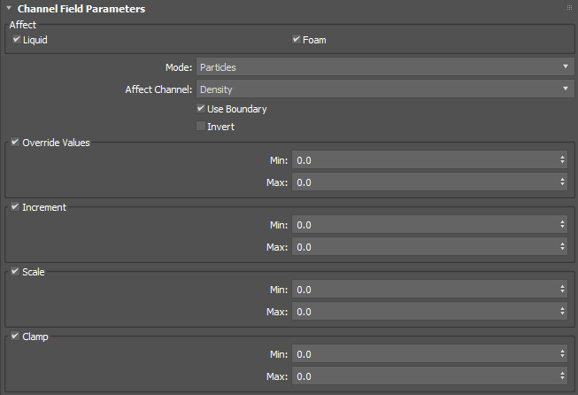 Use channel field objects to modify the values of voxel or particle channels in a fluid simulation, such as the density of liquid or foam.