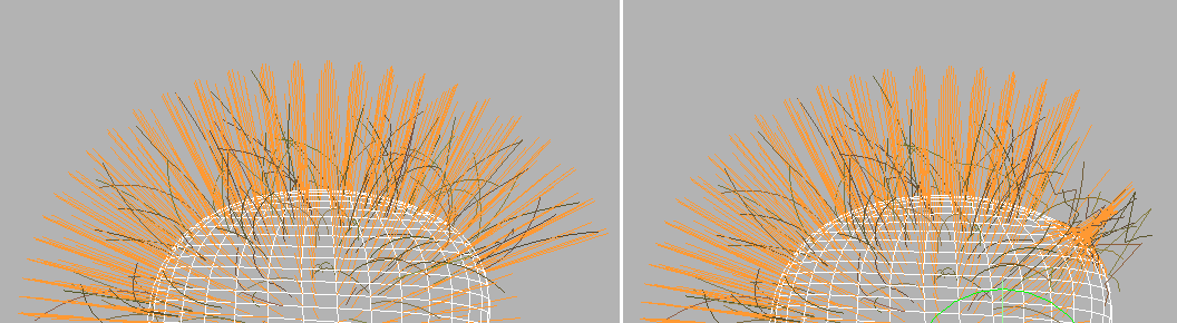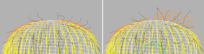 Left: Hair guides on top of head were scaled to zero length.