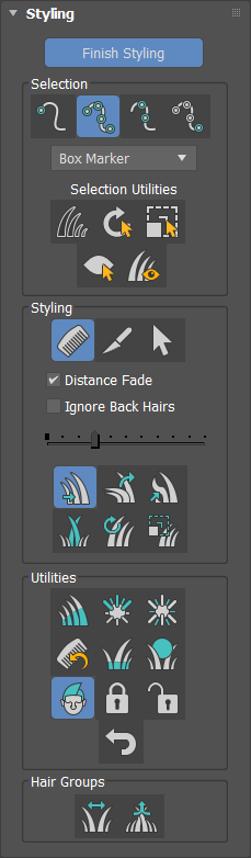 Click Style Hair to begin styling. Click Finish Styling to turn off styling mode. When you turn this button on, a brush is immediately available and by default the active tool is Translate. Turning on Style Hair accesses the Guides sub-object level in the Selection rollout and selects all guides.