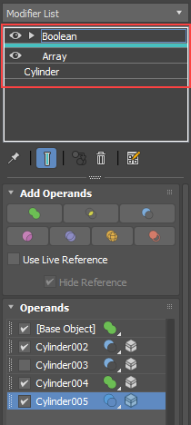 Operands list causes it to appear in the Modifier stack. Now, a new line in the Modifier Stack separates the Boolean modifier's base object from the selected operand, visually denoting your selection. The line is grey when the captured operand or its modifiers are instanced, otherwise the line is teal.
