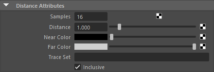 The distance shader uses sample rays to estimate the distance from the shading point to the nearest surface. This distance is mapped to a color linear gradient from near_color to far_color. You can use trace sets to include or exclude objects from the distance measurement.