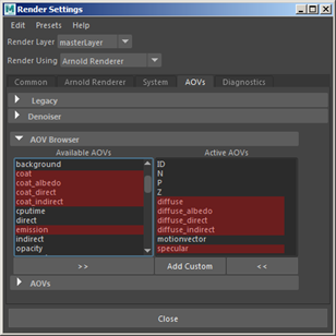 This is what we see when we look at the list of AOVs. We can see all of the above components in the AOV list, however, there are more AOVs other than what is in the standard_surface shader.