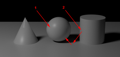 1: direct rays come from the light source. 2: indirect rays bouncing from the surface. |