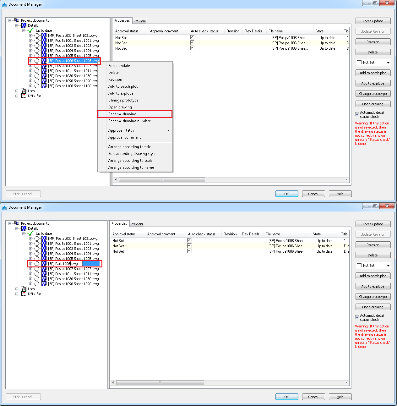 Some of the commands from the Document Manager dialog will not be available to use from a detail. Force update, Update revision, Revision, Change prototype, Rename drawing, Rename drawing number, Approval status and others will only be available when working in the model. Also, commands such as Delete, Batch plot and Explode which are executed when you click the OK button in the Document Manager, can only be finished while working in the model.