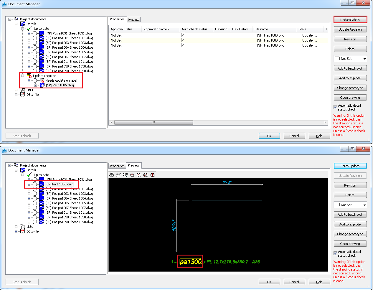 You can update drawings directly from the Document Manager. Additionally, you can control the Document Manager behavior related to the detail status check.
